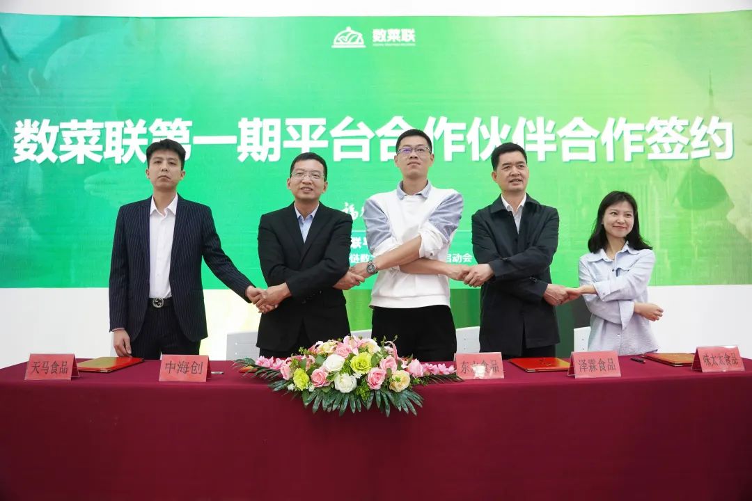 随后,天马食品、东水食品、泽霖食品、味太太食品、嘉乐食品、宏升兄弟、方便煮义、正味生物、金麦园食品、乐鸿国际、醉悦臣生物、大润优餐饮,共12家企业代表上台,作为数菜联第一期平台合作伙伴进行签约。