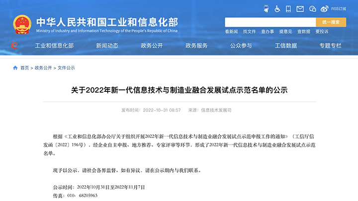 中开云(中国)官方集团子公司入选工信部2022年新一代信息技术与制造业融合发展试点示范名单